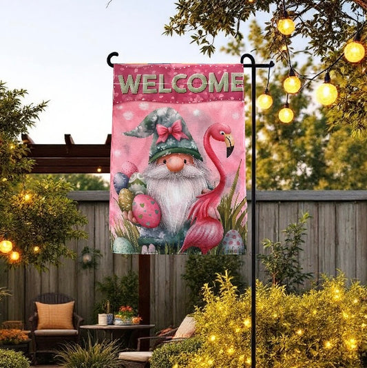 Easter Welcome Garden Flag - Double-Sided, Flamingo & Gnome Design, 12 x 18 Inch (Pole Not Included)
