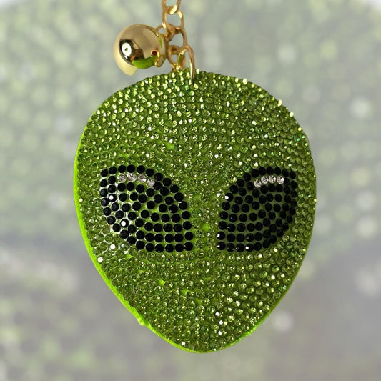 Extraterrestrial Crystal Bejeweled Keychain - Alien Head with Green Tassel, Rhinestone Accents. Choose Gold or Silver Chain