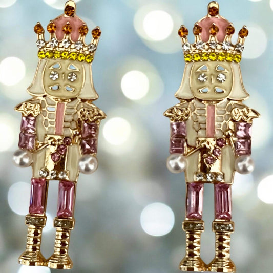 Festive Pink Nutcracker Stud Earrings with Shimmering Rhinestones