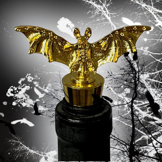 Eleganter Weinflaschenverschluss aus goldfarbenem Metall mit Fledermausmotiv – Halloween-Dekor – Bar-Accessoire