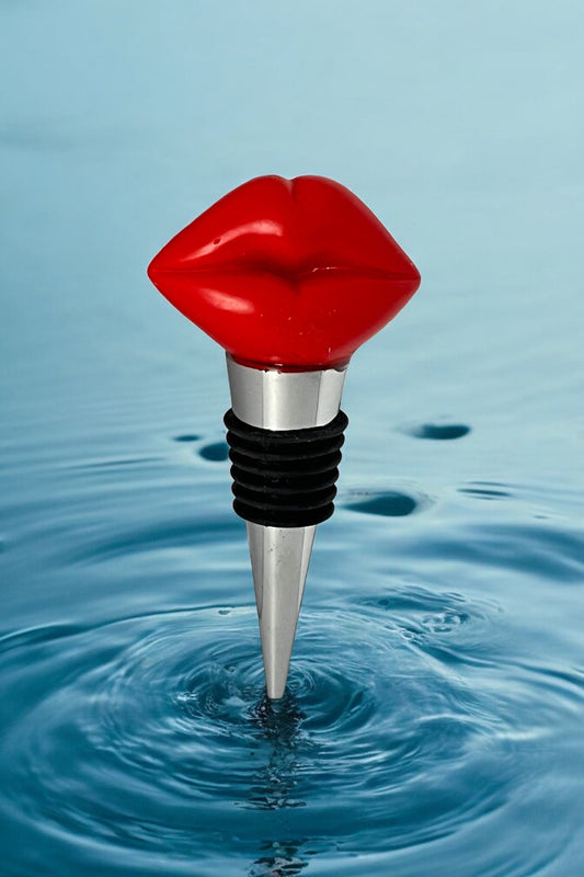 Glamouröser Weinflaschenverschluss mit roten Lippen – eine lustige Art, Wein frisch zu halten!