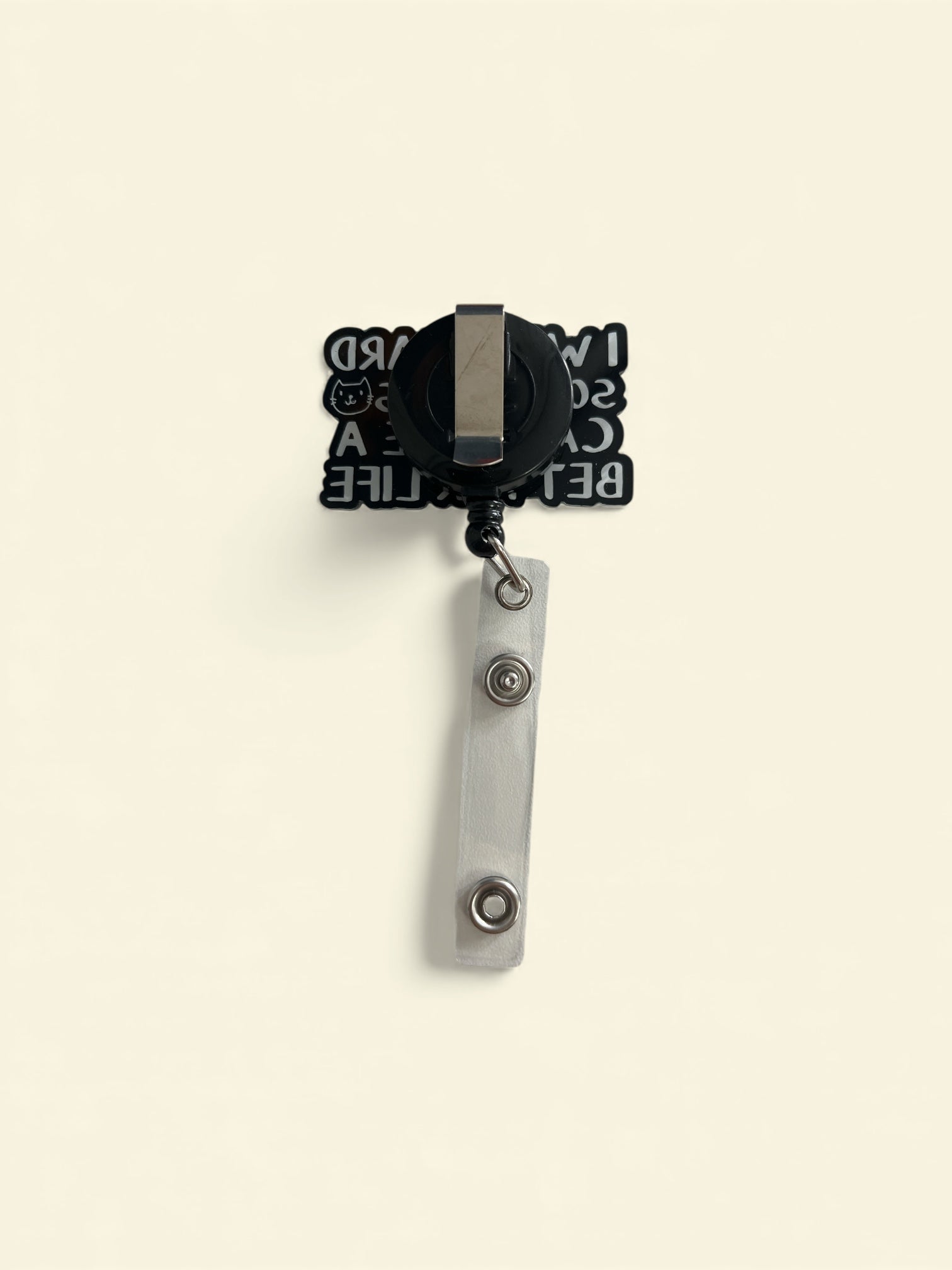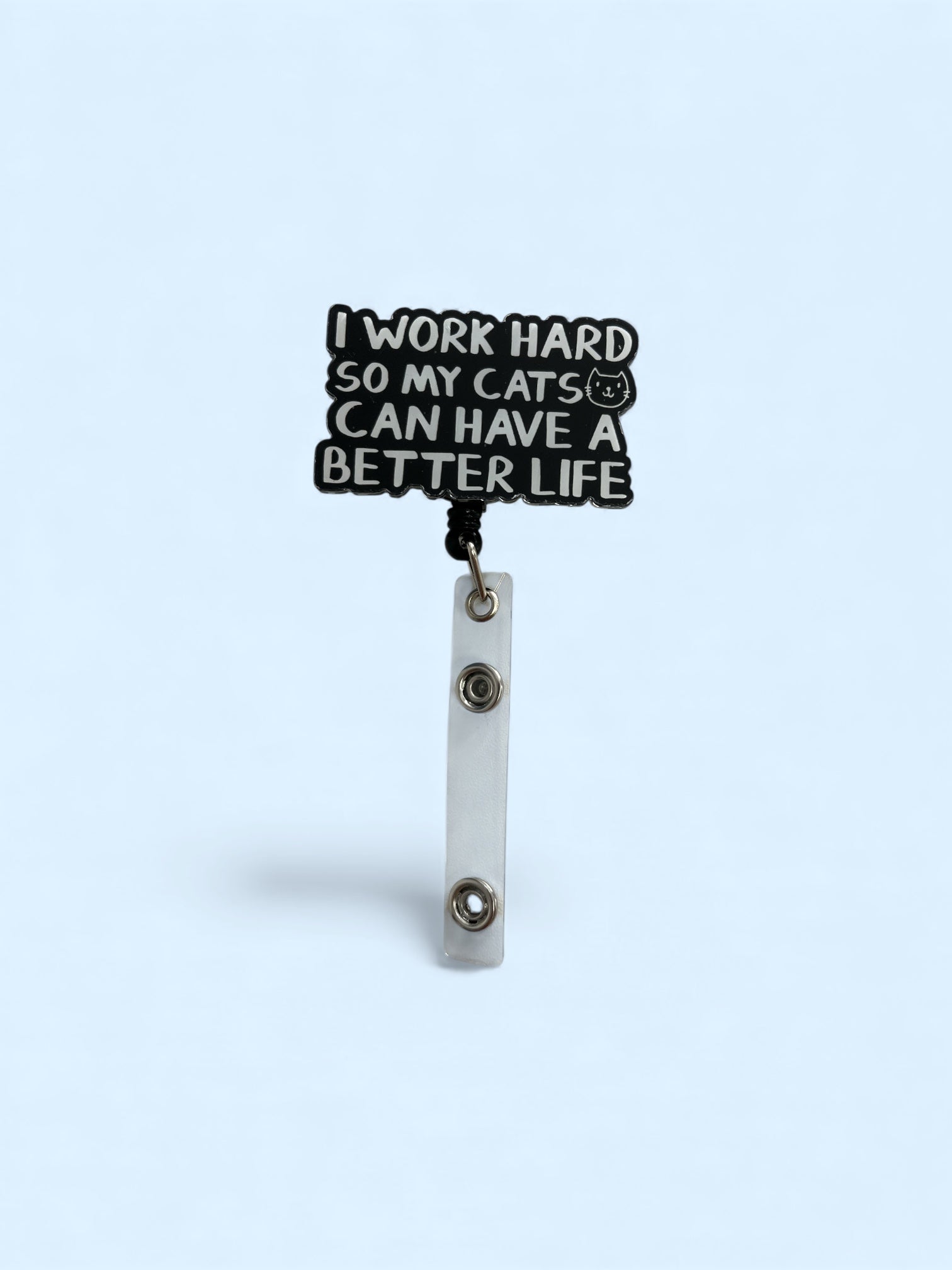 Show off your cat devotion with this fun and relatable retractable badge reel. The bold black-and-white design features the phrase “I Work Hard So My Cats Can Have a Better Life,” complete with a cute cat graphic. Practical for everyday use and perfect for cat lovers who proudly work for their furry overlords.