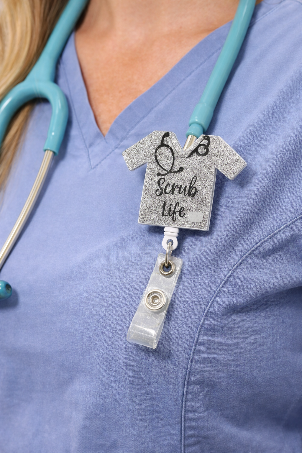 Fun and sparkly “Scrub Life” badge reel designed in the shape of a scrub top with a stethoscope graphic. The silver glitter finish adds personality to everyday work wear while the retractable reel keeps your ID easily accessible. Features a rotating alligator clip on the back for secure attachment to scrubs, pockets, or lanyards. Perfect for nurses, medical assistants, dental staff, hospital workers, and healthcare students who want a little style on their badge.