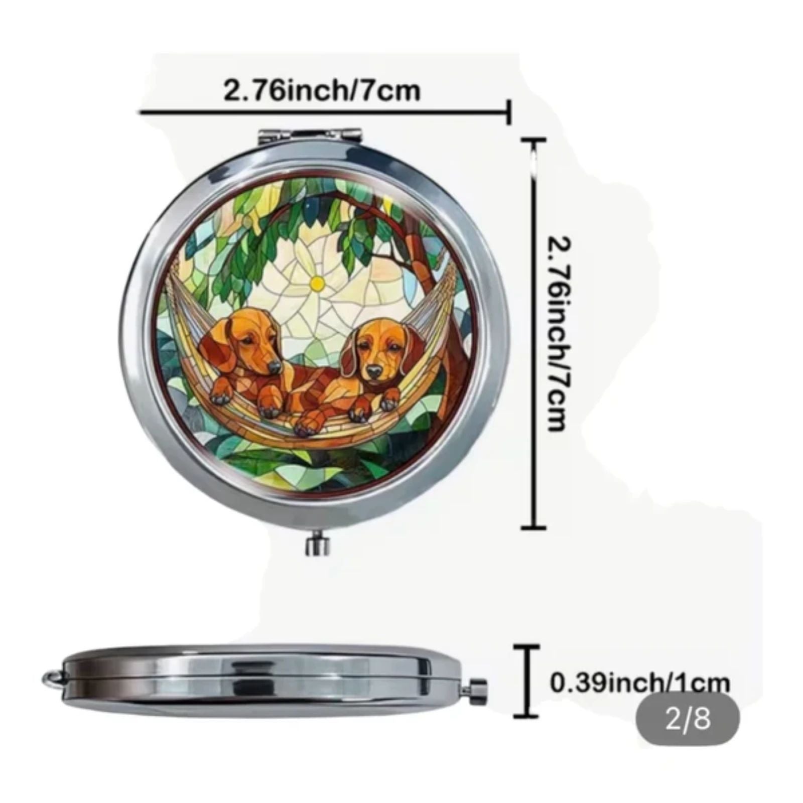 Round compact mirror featuring two dachshunds lounging in a hammock against a stained-glass style background. Silver-tone frame with a slim folding design and dual mirrors inside. Perfect for handbags, makeup touch-ups, and gifting to any dachshund lover.